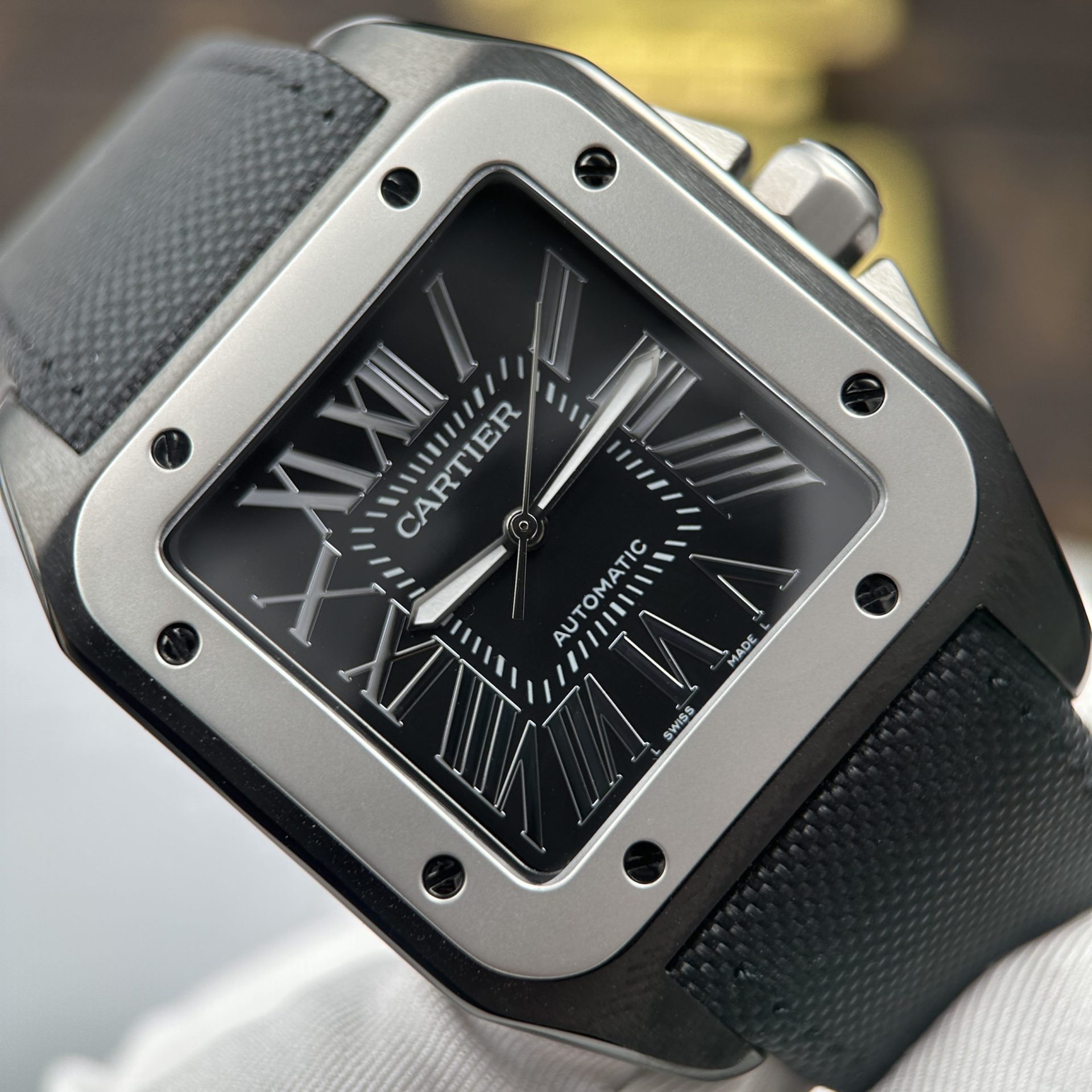 Đồng Hồ Cartier Santos 100 XL Replica Cao Cấp Viền Màu Xám Mặt Số Màu Đen Vỏ Mạ ADLC 41x51mm